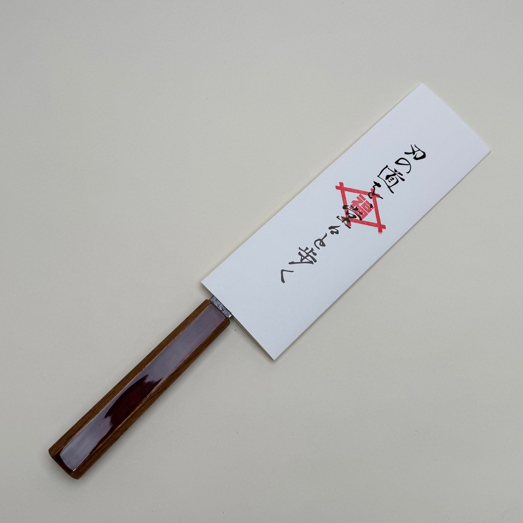 Fitted with an urushi lacquered oak handle, this knife offers a tactile, slightly grippy surface that improves with use. Durable and water-resistant, it provides a secure and comfortable grip with a refined traditional finish.